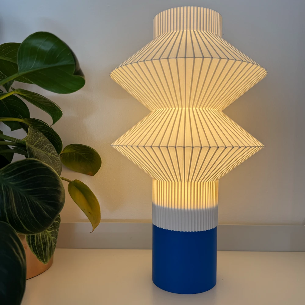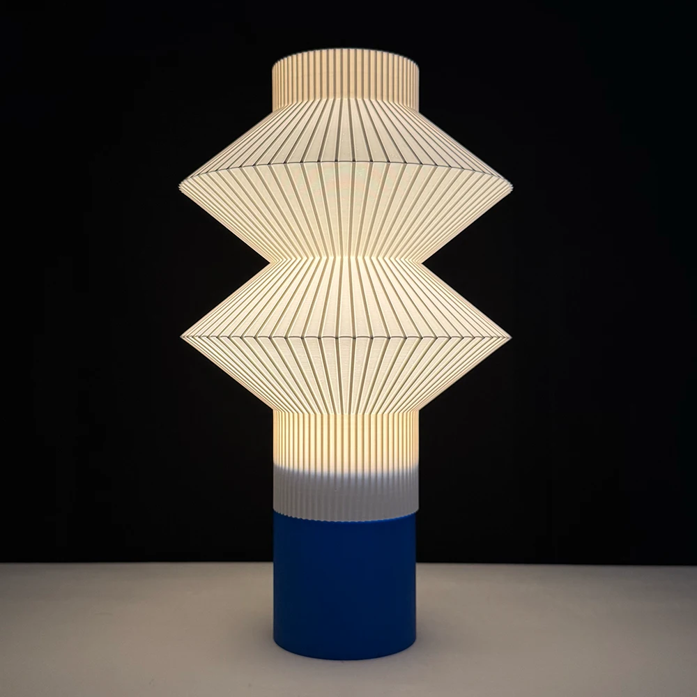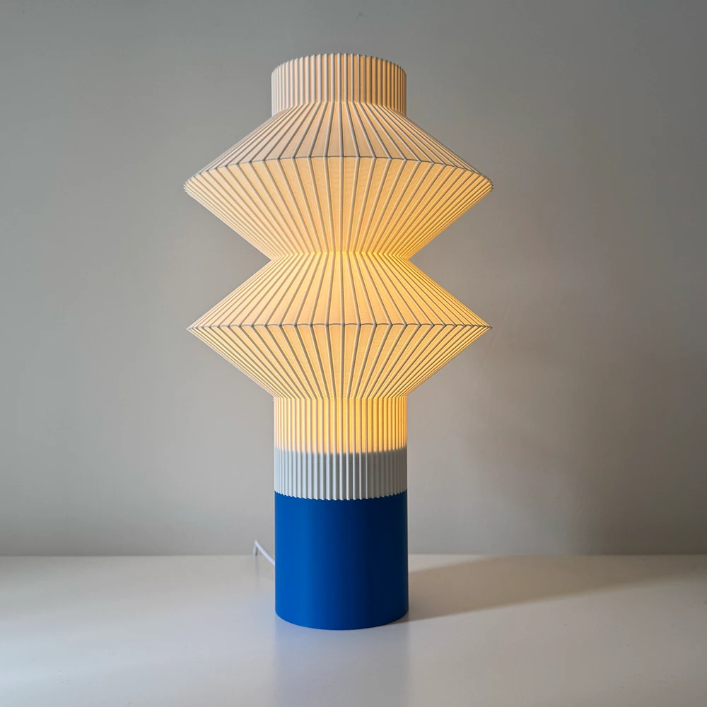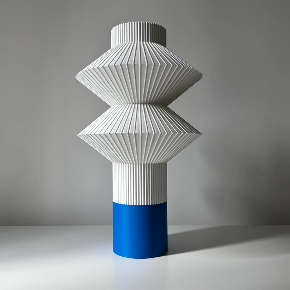 Designed by Juan Agudelo from Elementa Design. This sculptural lamp blends bold shapes, soft pleats, and a vibrant blue base to create a striking statement in any space. Modern, playful, and full of character — a true celebration of form and glow.